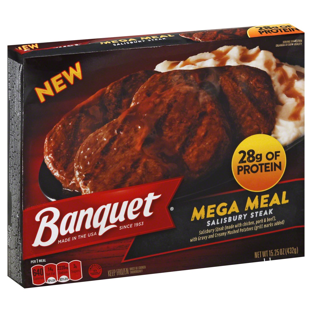 Like you, we believe in quality and good, honest value and trust you'll taste it in our savory salisbury steak served with creamy. Pickup snap ebt eligible $ 3. I've been married over 26 years and every time my husband wanted salisbury steak i am ashamed to say i would throw the banquet brand in the oven. See ingredients, nutrition, and other product information here. This is the results of my efforts and i must say, the taste is very close, but even better. This is cheap, easy and freezes very well. I loved them all and very handy to take for lunch. Give yourself a boost after an intense workout at. 1 can (8 oz drained wt each) sliced mushrooms, drained. (made with chicken, pork, beef) with mashed potatoes and corn. Saturated fat 4.5 g 23. We don't know when or if this item will be back in stock. ($0.15 / ounce) club card price.